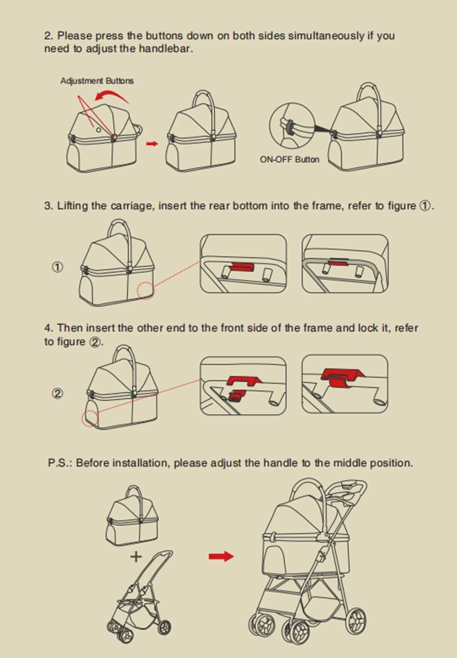 1. Unfold the carriage, open the zipper, fix the support rod onto the buckles.