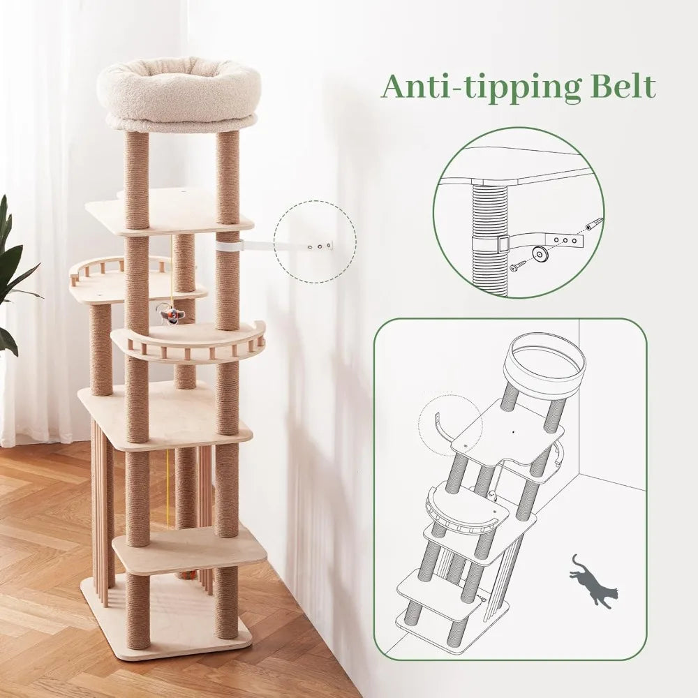 - 【Sturdiness & Stability】The cat furniture is supported by premium pine board and solid wood column. Anti-tipping belt also protect the safety of the cat. Double safety protect your cat avoid the cat condo topple.